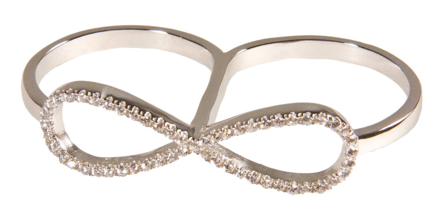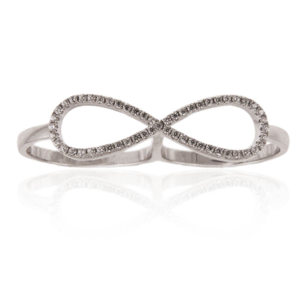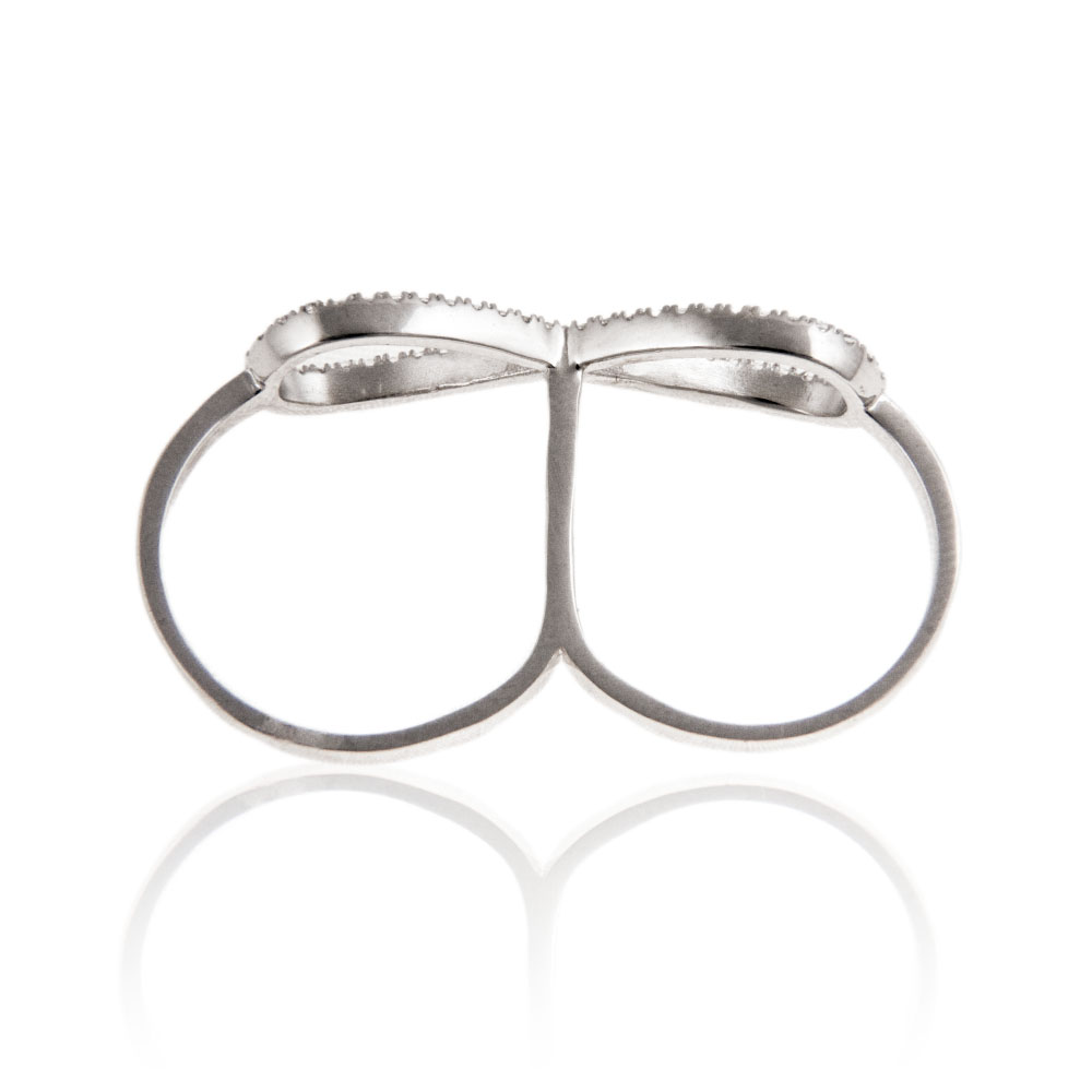 Dvojni prstani so veliki modni hit. Mi pa smo ta trend nadgradili s posebno simboliko: prstan je na sprednji strani oblikovan v simbol neskončnosti ter posut z drobnimi kristalčki cirkonija. Prstan se nosi na dveh prstih in je oblikovan tako, da se obema prstoma udobno prilega. Odlično darilo za vaša najdražje.