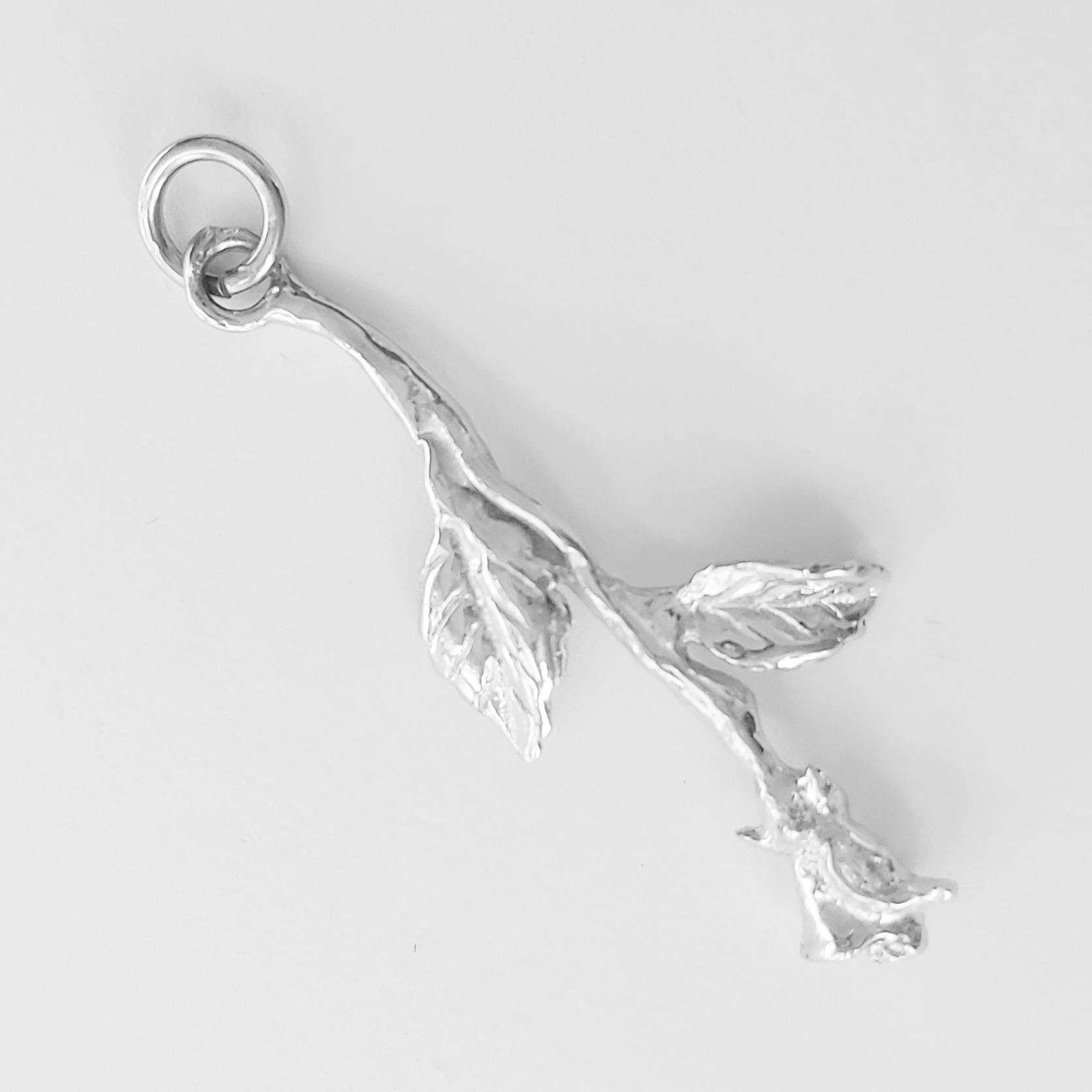 Srebrn obesek v obliki viseče vrtnice.
