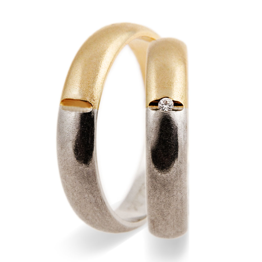 Decentna poročna prstana sta narejena iz kombinacije belega in rumenega zlata. Na vrhu sta diagonalno združena.