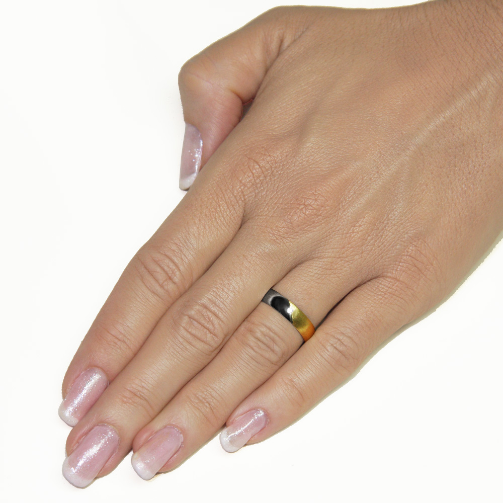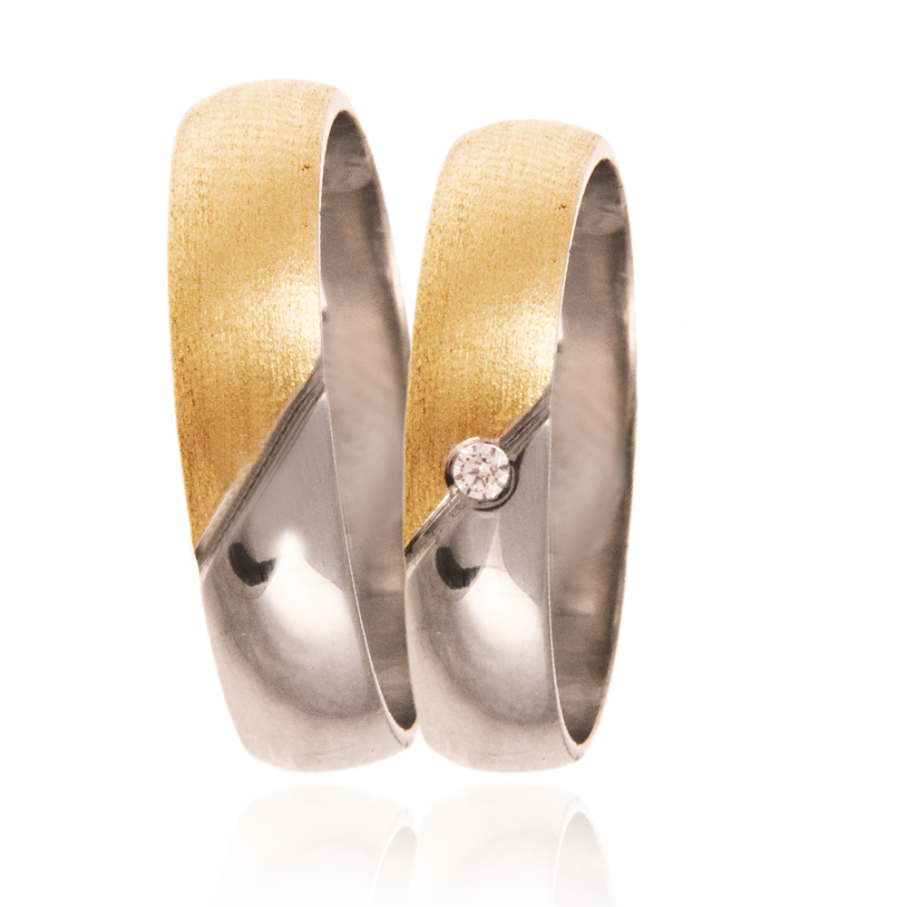 Poročna prstana sta izdelana v kombinaciji rumenega in belega zlata s polkrožno površino. Kontrast med belim in rumenim zlatom je lepo poudarjen z matirano površino na rumenem delu. Gravirana diagonala čez prstan loči matiran del iz rumenega zlata od gladkega iz belega zlata. Nežen kamen v ženskem prstanu je pika na i. Okovan je lahko po vajini izbiri s cirkonom ali pravim briljantom.