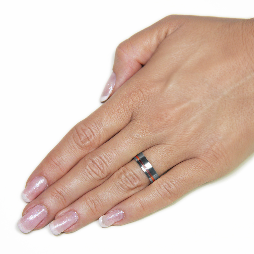 Poročna prstana sta izdelana iz belega in rdečega zlata. Rdeči del, je poglobljen. Barvno kombinacijo dodatno poudari tudi matirana površina belega zlata, ki je v kontrastu z gladko površino rdečega. Ženskemu prstanu da dodatno eleganco kamenček po vajini izbiri – cirkon ali večni briljant.