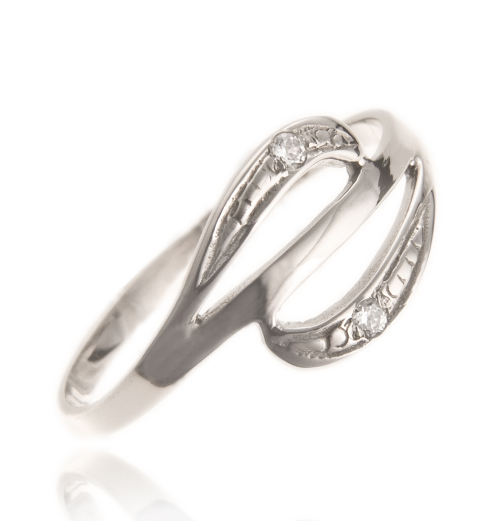 Prstan iz belega zlata ima na vsaki strani manjši lok, znotraj katerega je okovan kamen. Eleganten in drugačen.