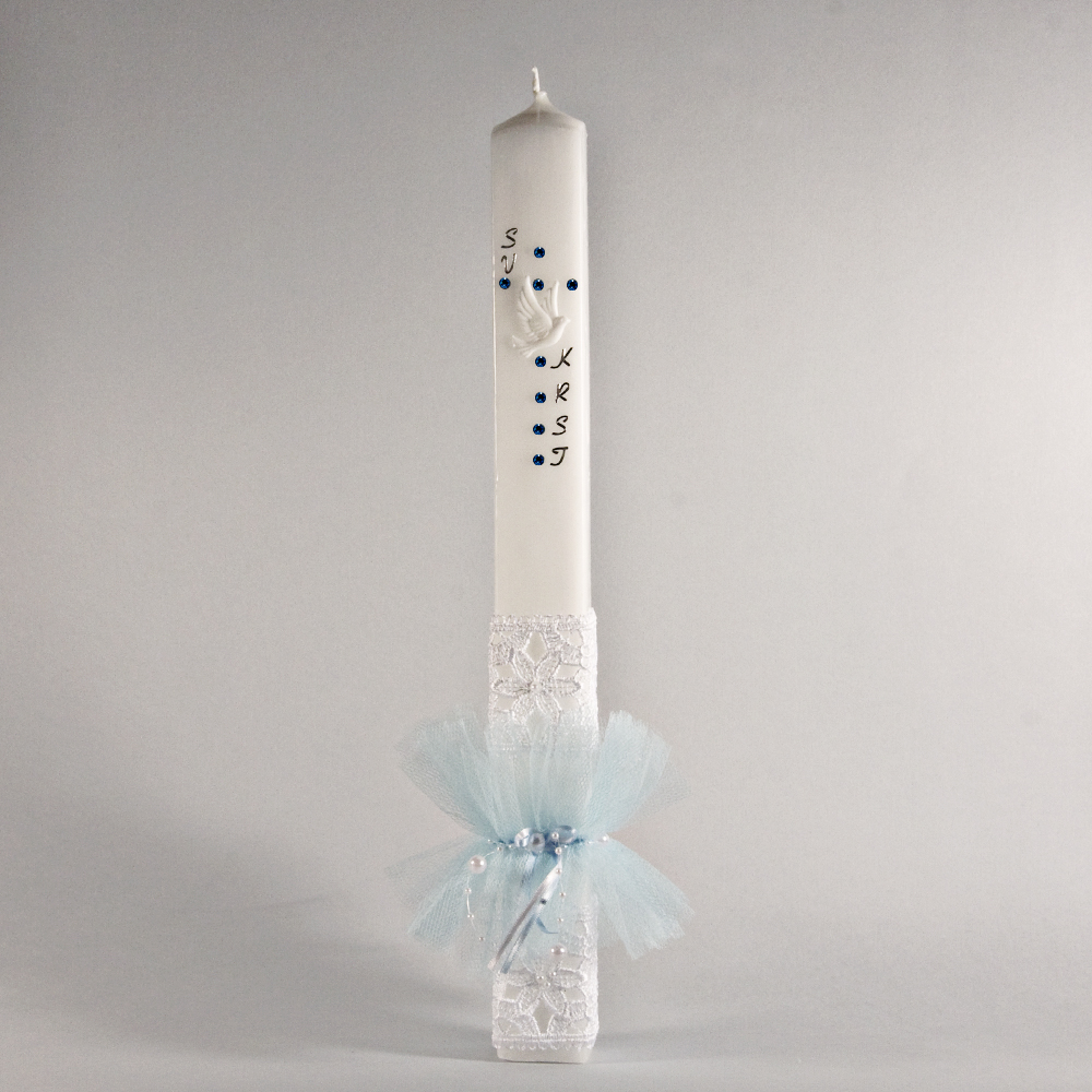 Bogato okrašena krstna sveča s swarovski kristali, čipko ter tilom. Ima štirikotno obliko. Na vašo željo brezplačno pripišemo ime krščenca in datum krsta. Svečo prejmete zapakirano v kartonski emabaži.