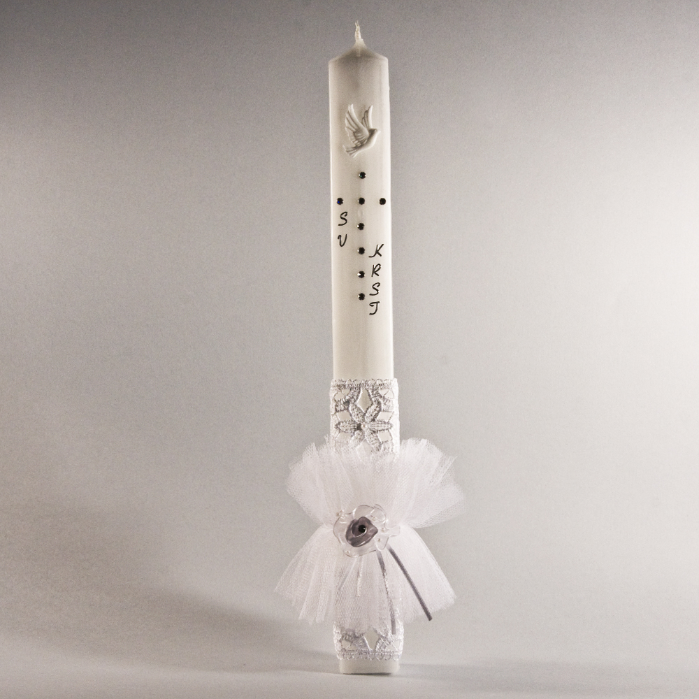 Bogato okrašena krstna sveča s swarovski kristali, čipko ter tilom. Ima štirikotno obliko. Na vašo željo brezplačno pripišemo ime krščenca in datum krsta. Svečo prejmete zapakirano v kartonski emabaži.