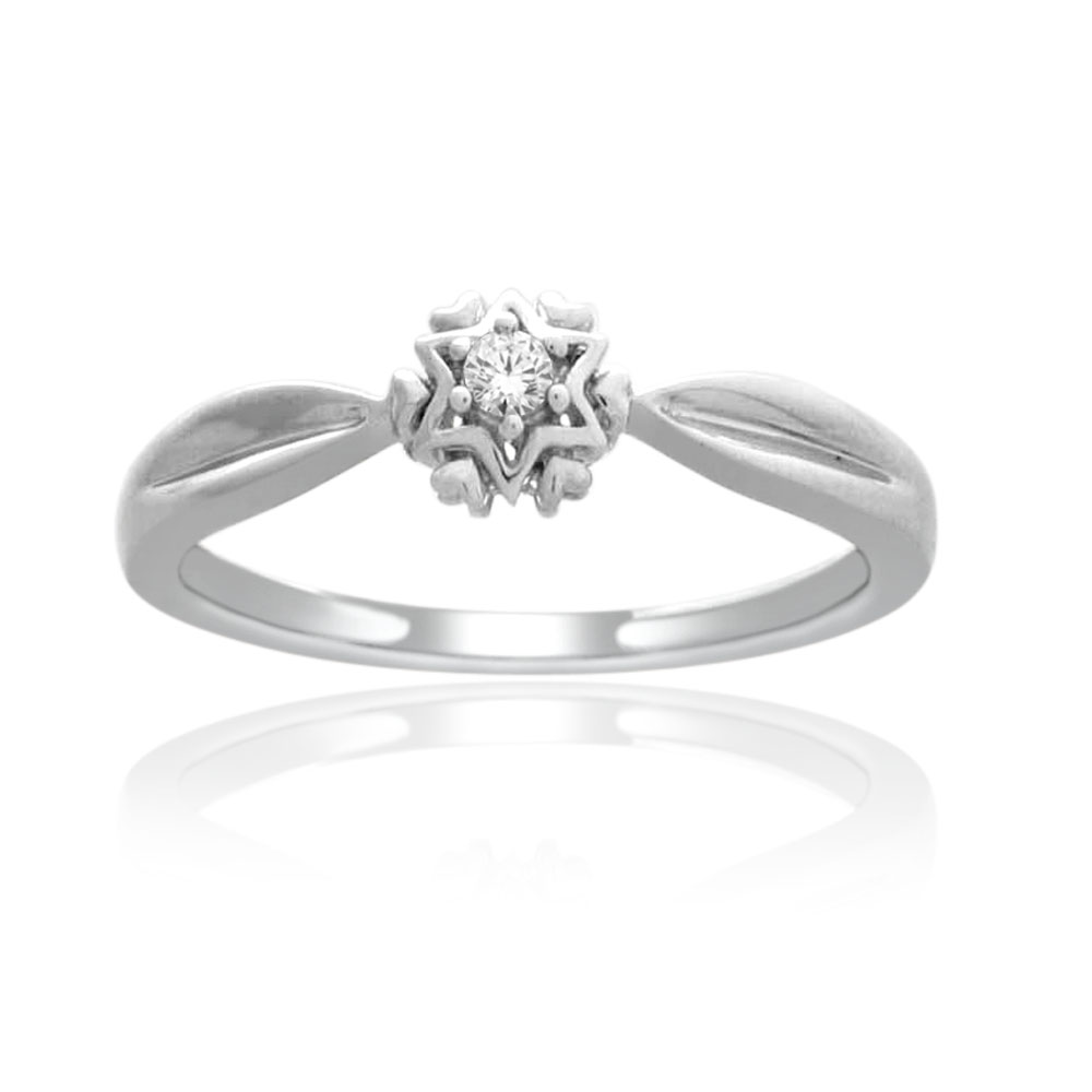Čudovit zaročni prstan iz belega zlata, ki ima kot v roži ujet briljant.