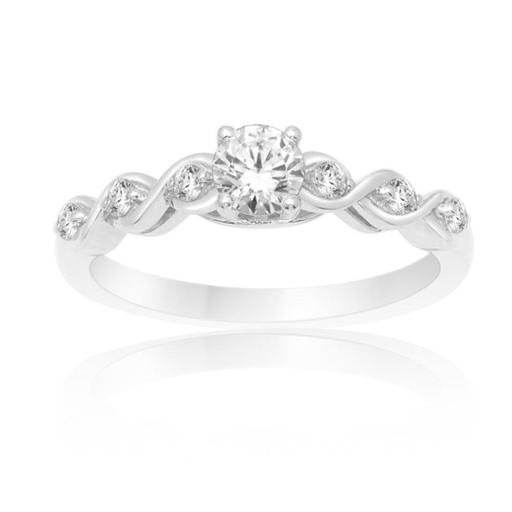Posebna oblika zaročnega prstana iz belega zlata mu daje prestižen, poseben izgled, ki ga nadgrajujejo še čudoviti briljanti.
