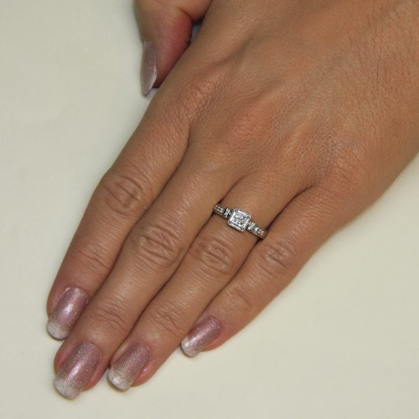 Posebna oblika zaročnega prstana iz belega zlata mu daje prestižen, poseben izgled, ki ga nadgrajujejo še čudoviti briljanti.